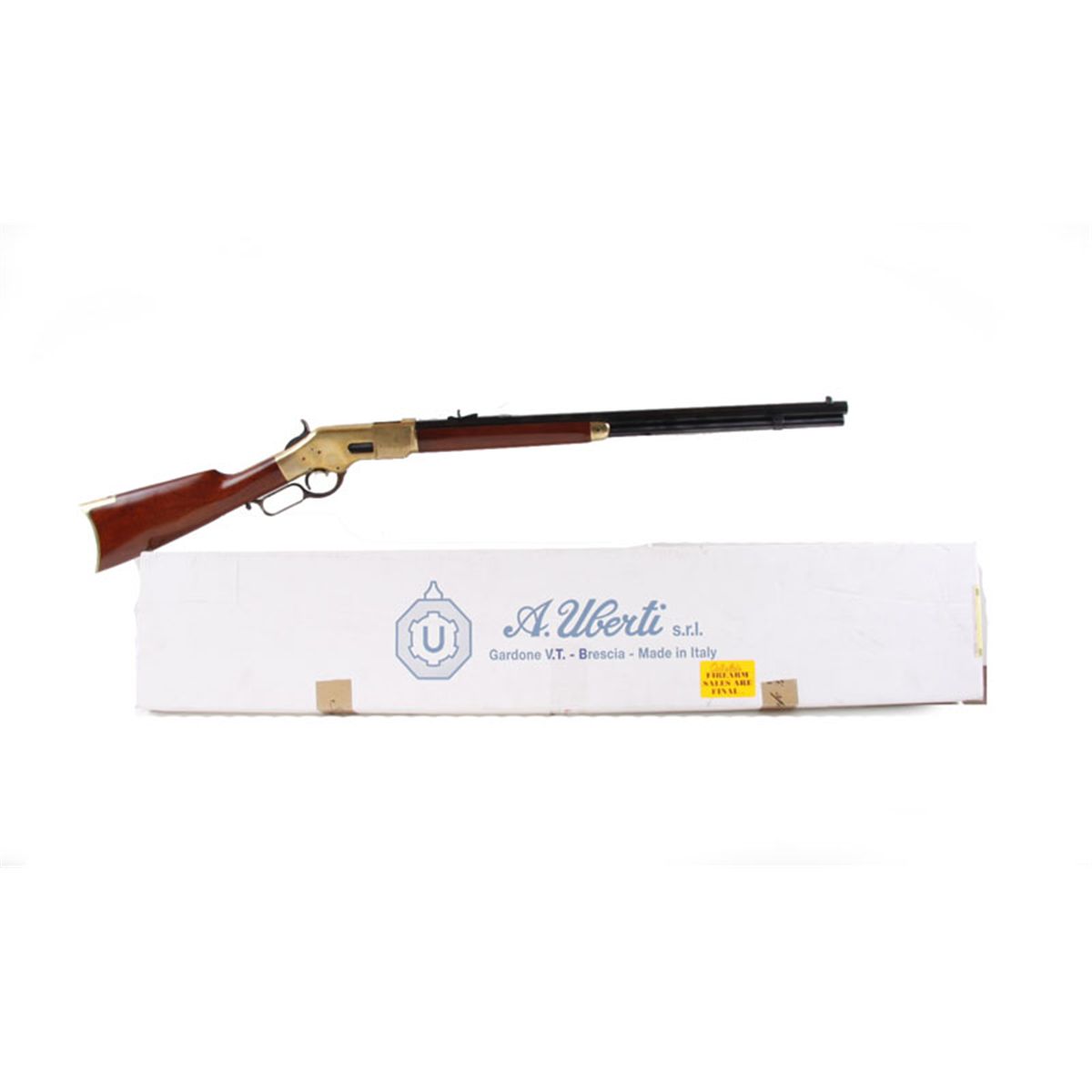 Uberti Yellow Boy Cal .45LC SN:W27770 Modern replica of the Yellow Boy lever action rifle from the 1860s. Brass colored frame and curved butt plate, hi-gloss smooth wood straight grip stock and forearm, case color hammer and lever, 24" blued octagonal bModern replica of the Yellow Boy lever action rifle from the 1860s. Brass colored frame and curved butt plate, hi-gloss smooth wood straight grip stock and forearm, case color hammer and lever, 24" blued octagonal barreland blued full length tubular magazine with adjustable rifle sights, good bore and action. Included in original card board shipping box and instructions. Condition: Near new with no sign of use.