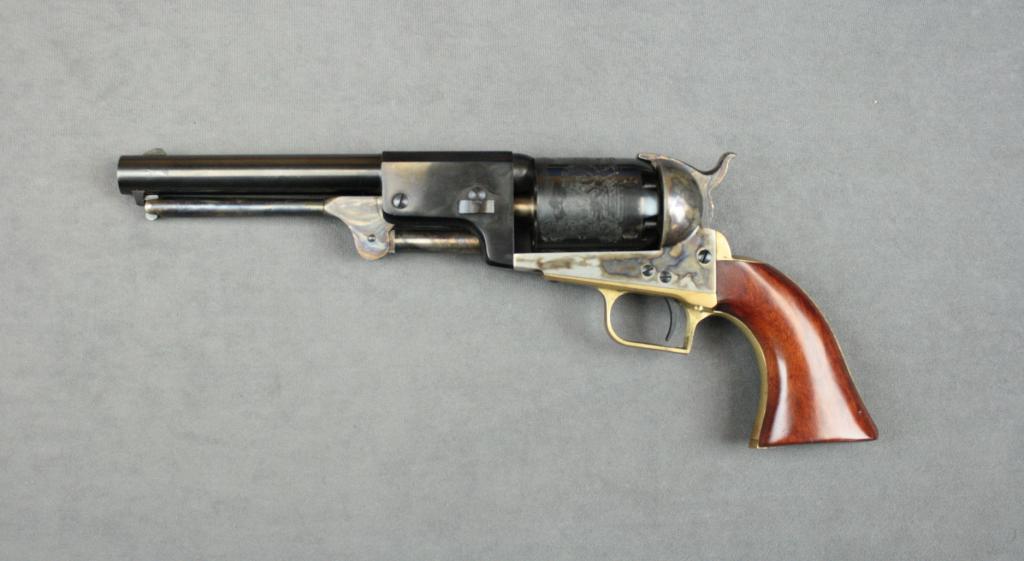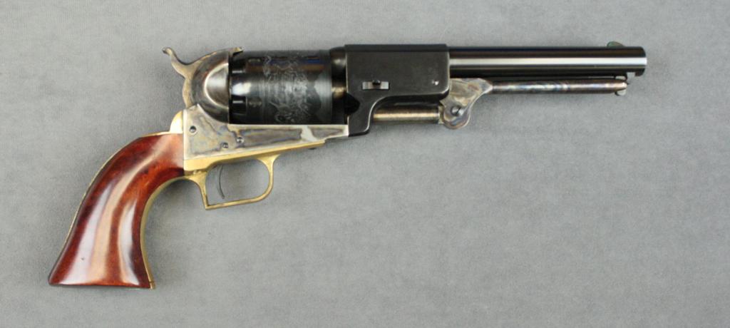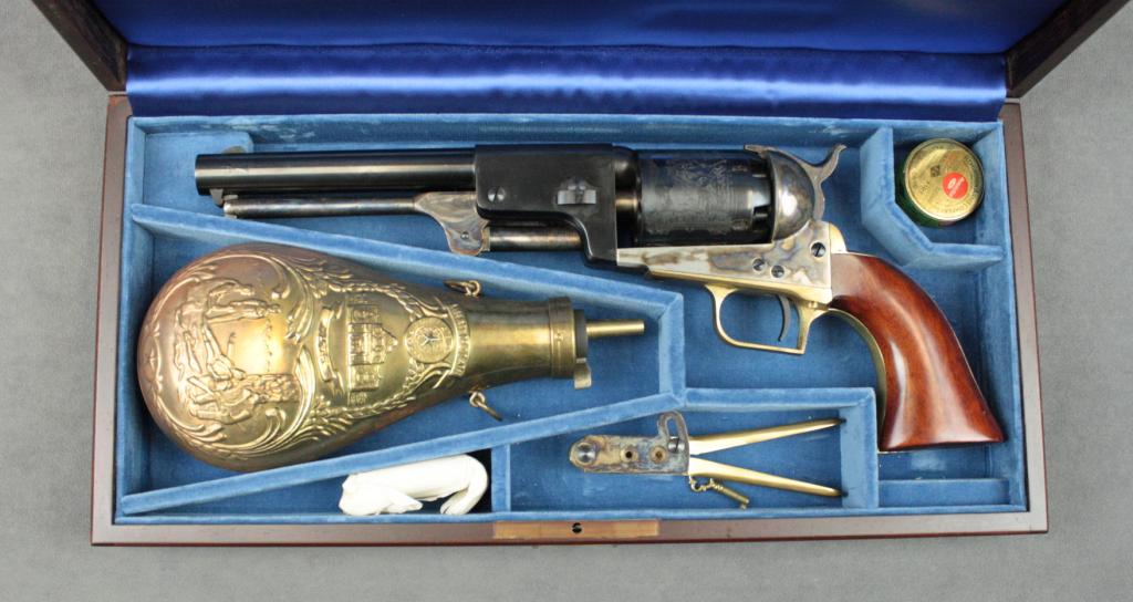 Uberti copy of a Colt First Model Dragoon percussion revolver, .44 cal., 7-1/2” barrel, black and case hardened finish, smooth wood grips, #06213. This revolver is in overall like new condition and is accompanied by awood presentation box that is lined and has compartments for the gun, a brass powder flask, bullet mold and cap tin. Est.: $250-$500.