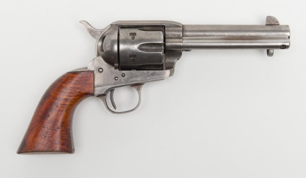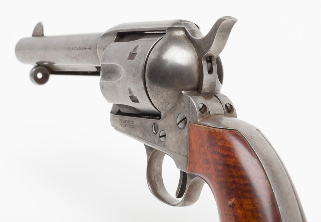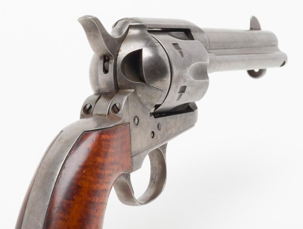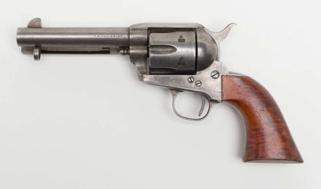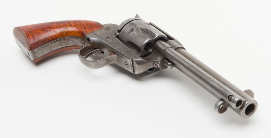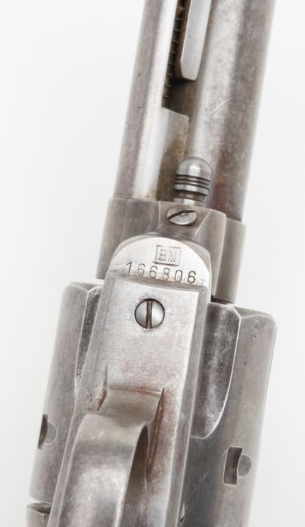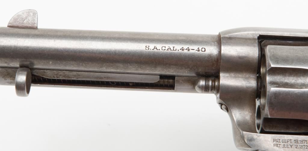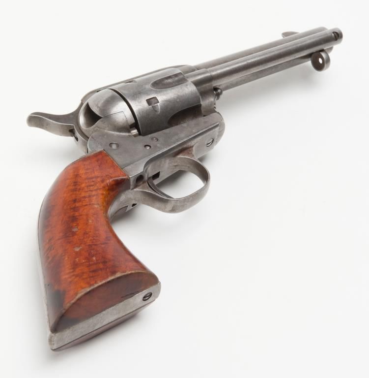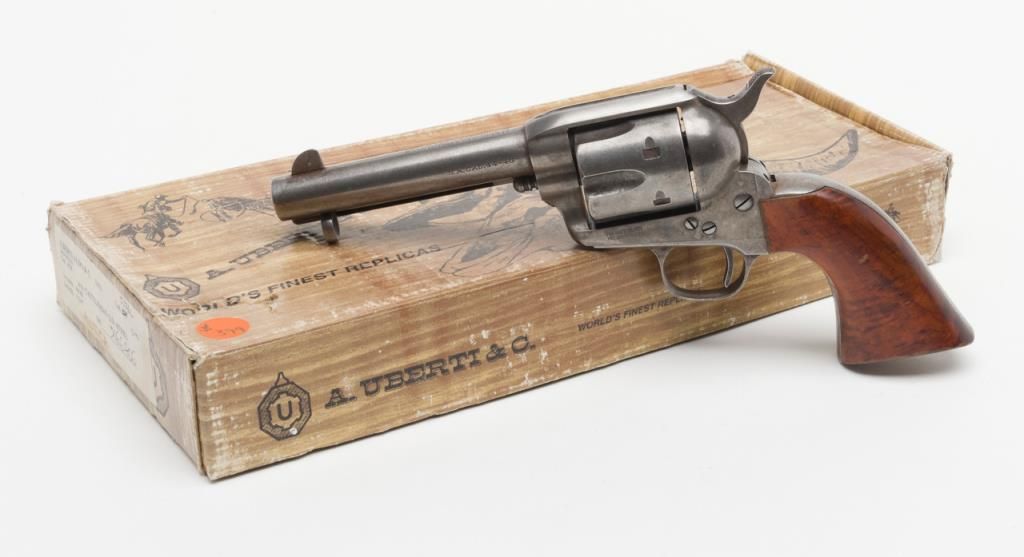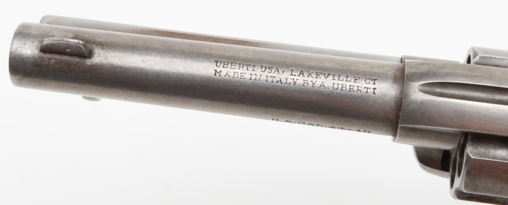 Uberti copy of a Colt SAA revolver (Cattleman Model), .44-40 cal., 4-3/4” barrel, wood grips, #166806 in overall very good condition with a grey patina, crisp action and markings, very good bore and grips; with factory cardboard box. (C&R). Est.: $400-$800.