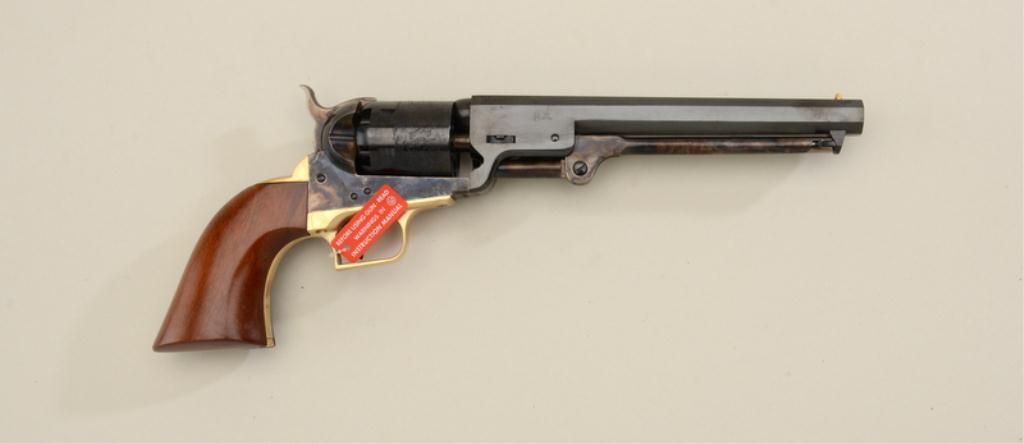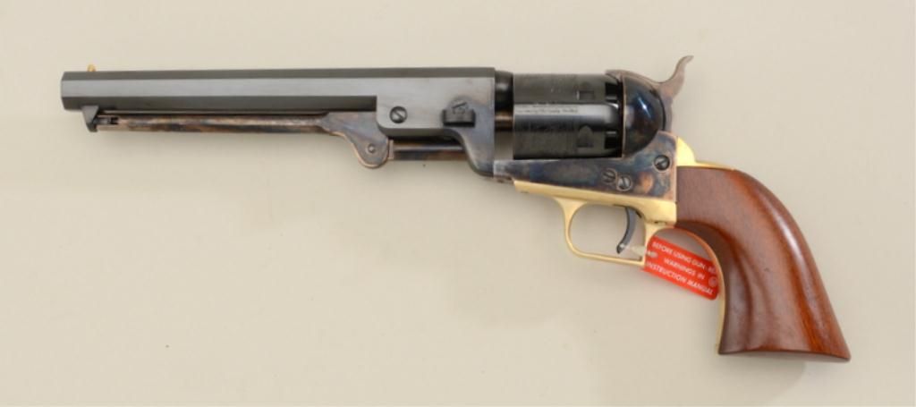 Uberti modern copy of a Colt Model 1851 Navy percussion revolver, .36 cal., 7-1/2” octagon barrel, blue and case hardened finish, wood grips, #A86316. This gun is in overall excellent condition showing little handling;with factory cardboard box and instructions. Est.: $300-$600.
