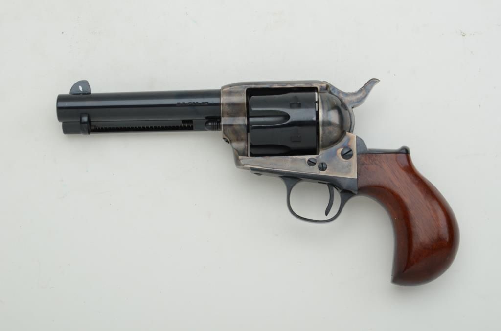 Uberti single action revolver with bird’s head profile grips, .45 cal., 4-3/4” barrel, blue and case hardened finish, smooth hardwood grips, #010731 in like new condition showing little handling and in factorycardboard box with instructions. Est.: $300-$600.