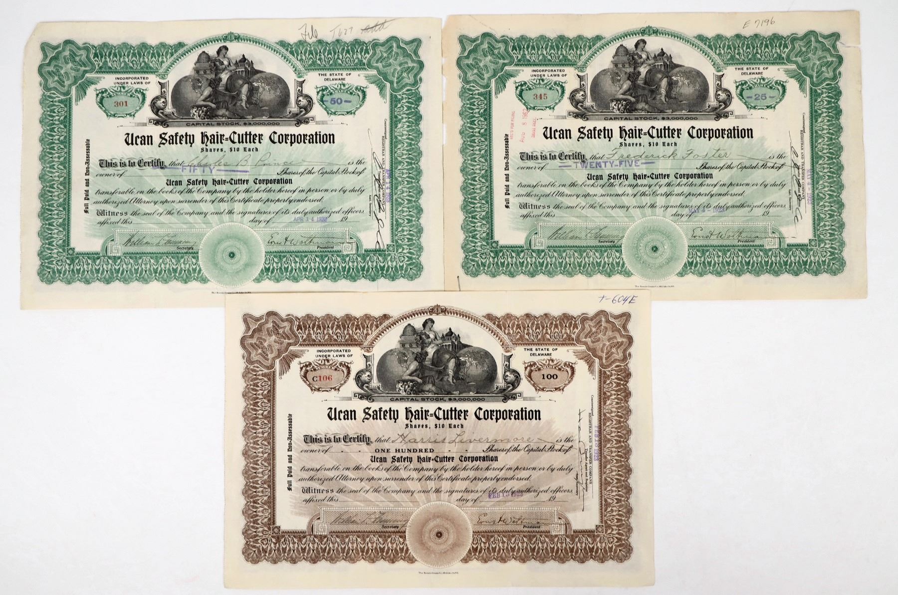 Three stock certificates in the Ucan Safety Hair- Cutter Corporation.