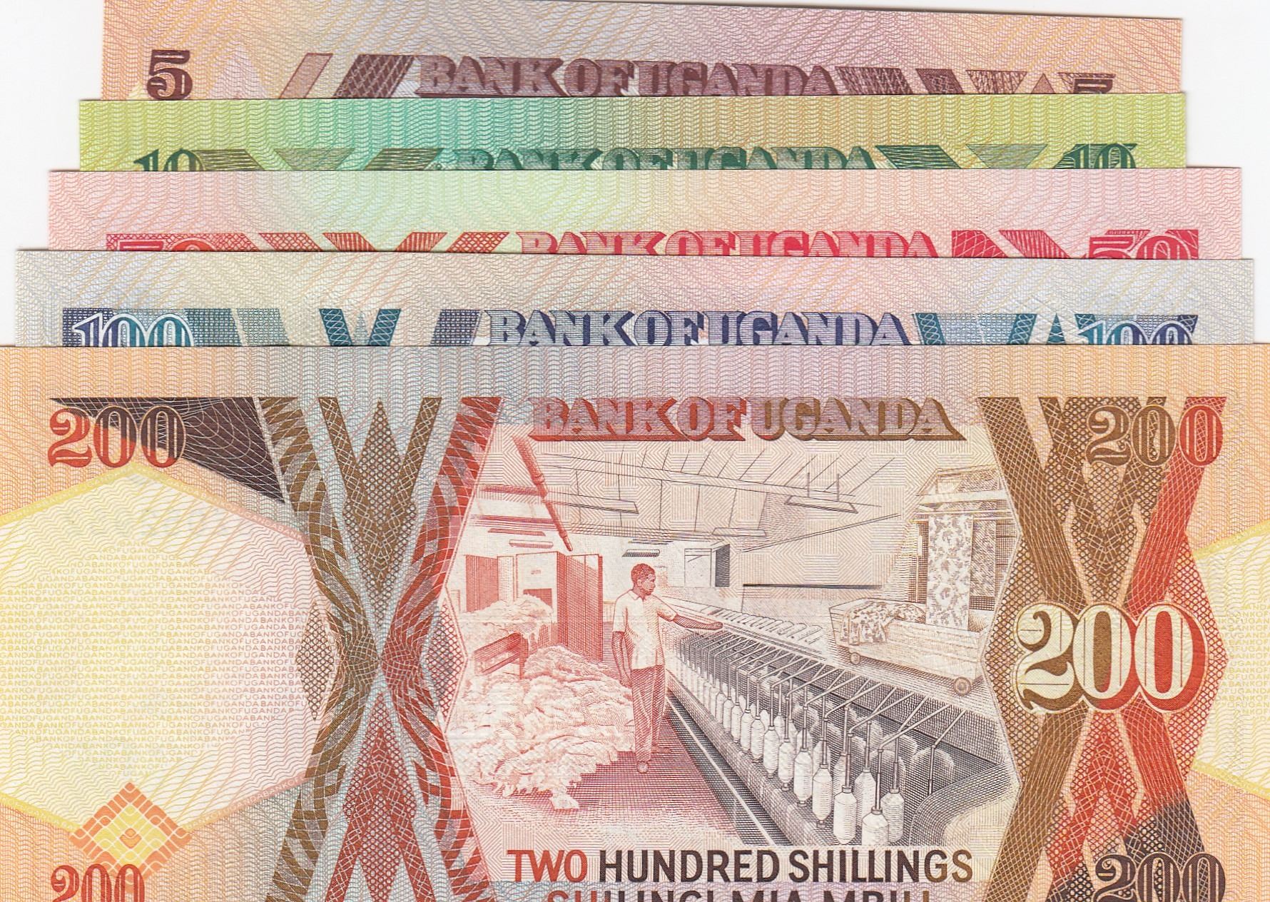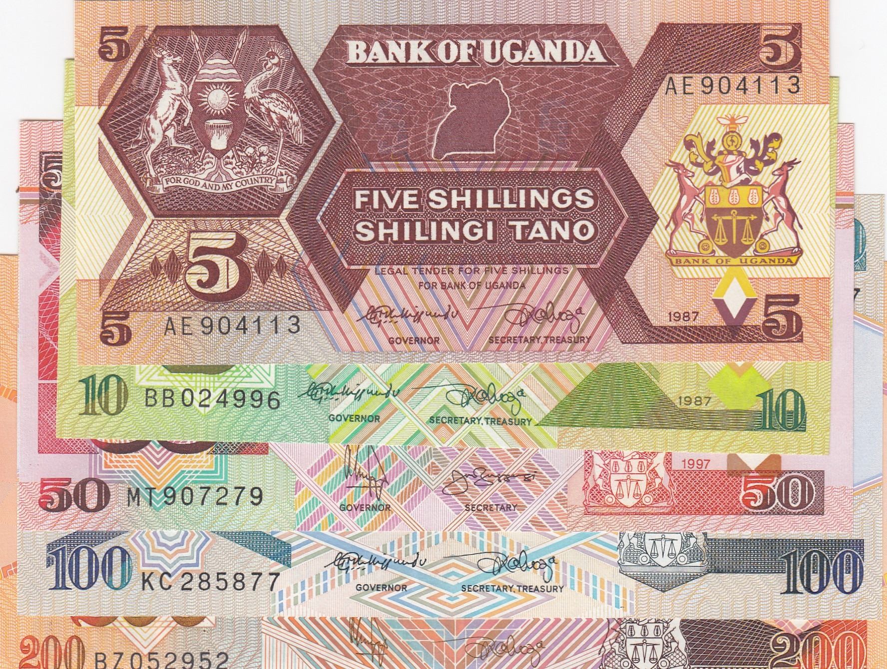 Uganda, 5 Shilings, 10 Shilings, 50 Shilings, 100 Shilings and 200 Shilings, 1987/1997, UNC, (Total 5 banknotes)br/