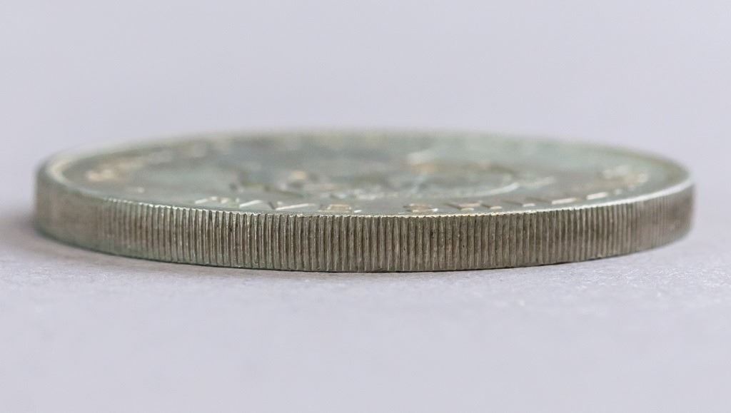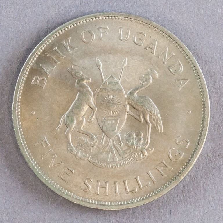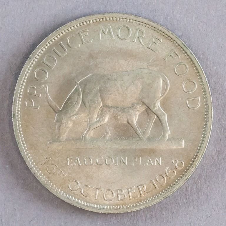 Uganda coin. Commemorating F.A.O. Obverse: Coat of arms. Lettering: · BANK OF UGANDA · FIVE SHILLINGS. Reverse: Cow Motif. Lettering: PRODUCE MORE FOOD / F·A·O· COIN PLAN / 16TH OCTOBER 1968. Diameter: 4 cm. 27 grams.