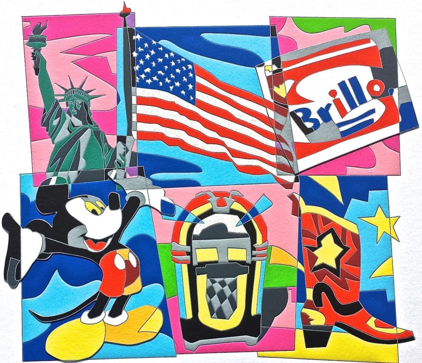 Artist: Ugo Nespolo. Medium: Original Serigraph. Title: AMERICAN DREAM. Size: 50x50cm. Hand Signed and Numbered. Artist and Composer Mark Kostabi was born in Los Angeles in 1960 to Estonian immigrants. Raised in Whittier, California, he studied drawing and painting at California State University, Fullerton. Kostabi moved to New York in 1982, and by 1984, emerged as a leading figure in the East Village art scene where he cultivated a provocative media persona by publishing self-interviews reflecting on the commodification of contemporary art. By 1987, his work was widely exhibited in New York galleries as well as prominently throughout the United States, Japan, Germany and Australia. He inspired extensive international press coverage in 1988 when he founded Kostabi World, his Manhattan art studio, which employs numerous painting assistants and idea people. Beginning in the early 1990s Kostabi's work has been widely exhibited throughout Italy. Kostabi established a second home in Rome in 1996. Dividing his time between Rome and New York enabled him to dramatically enhance his presence in the Italian art scene.: Ugo Nespolo (born 29 August 1941 in Mosso, Biella) is an Italian painter and sculptor, particularly known for his experimental films, his applied arts works and his artistic collaborations in advertising, theatre and literature..