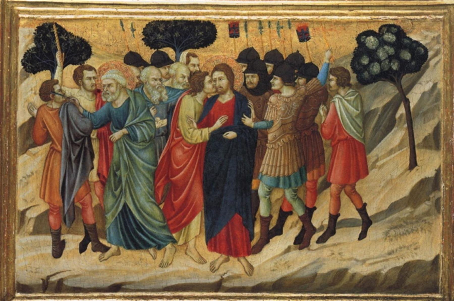 Artist: Ugolino di Nerio  - Title: Betrayal by Judas  - Medium: Fine Art Giclee on Canvas  - Image Size: Approximately 20 inches x 13.25 inches  - Unframed on Unstretched Canvas - Biography: Ugolino di Nerio c.(1280? - 1349) was an Italian painter active in his native city of Siena and in Florence between the years 1317 and 1327. He was a follower of Duccio di Buoninsegna, from whose Maestà some of his scenes are clearly derived. He was a leading master who contributed to the spread of Sienese painting in Florence by earning commissions to paint in the two main basilicas there, Santa Maria Novella and Santa Croce.