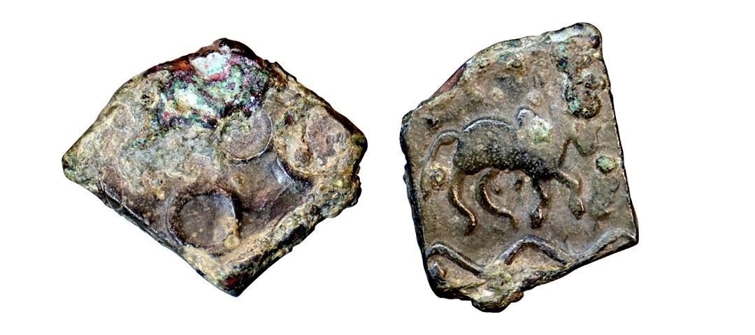 Ujjain (2nd-1st Century BC), Copper Unit, 3.09 gms, Maheshwar type, Obverse: Bull to right, Reverse: Ujjain symbol, exact type unlisted, very fine+, rare.