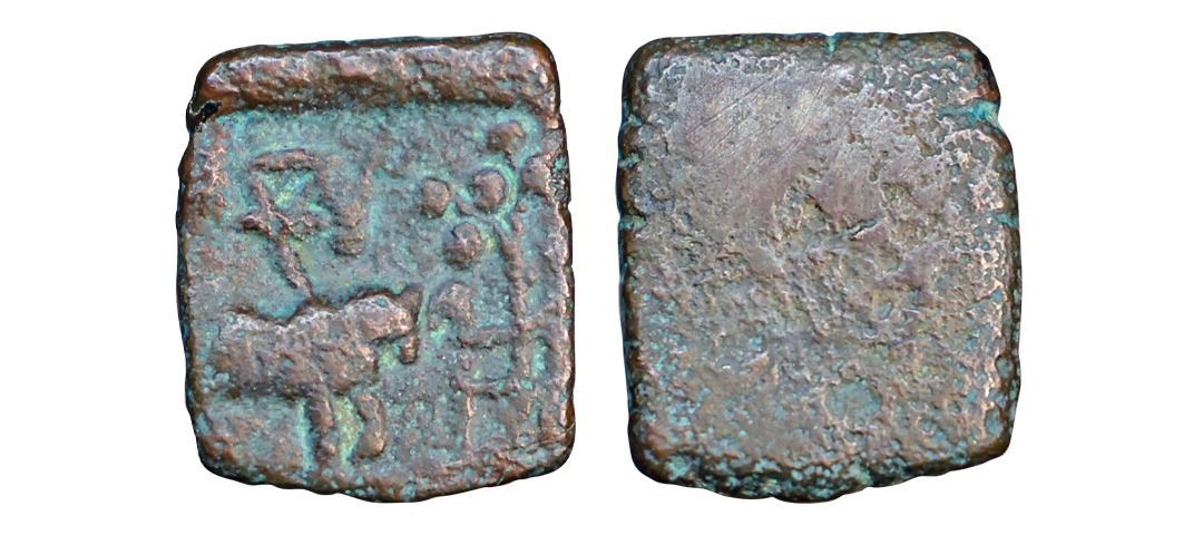 Ujjain Region, Copper Unit, 2.04 gms, Horse to right with indradhwaja above & tree in railing in fro