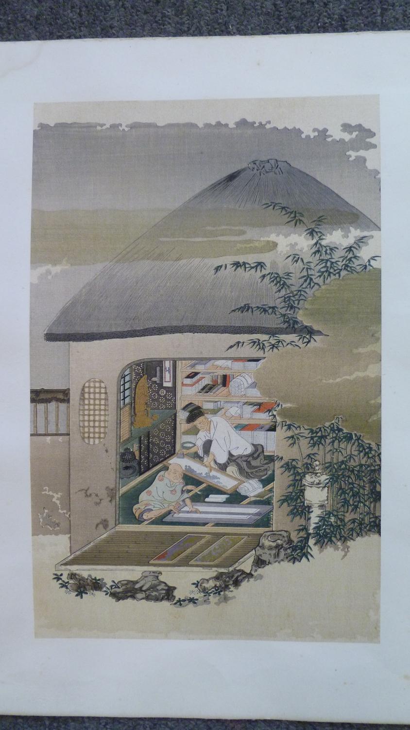 "The Screen Printing Studio", Unsigned 19th C. Woodblock print, mounted. Fine & fresh impression, 11-7/8" x 7-1/2"