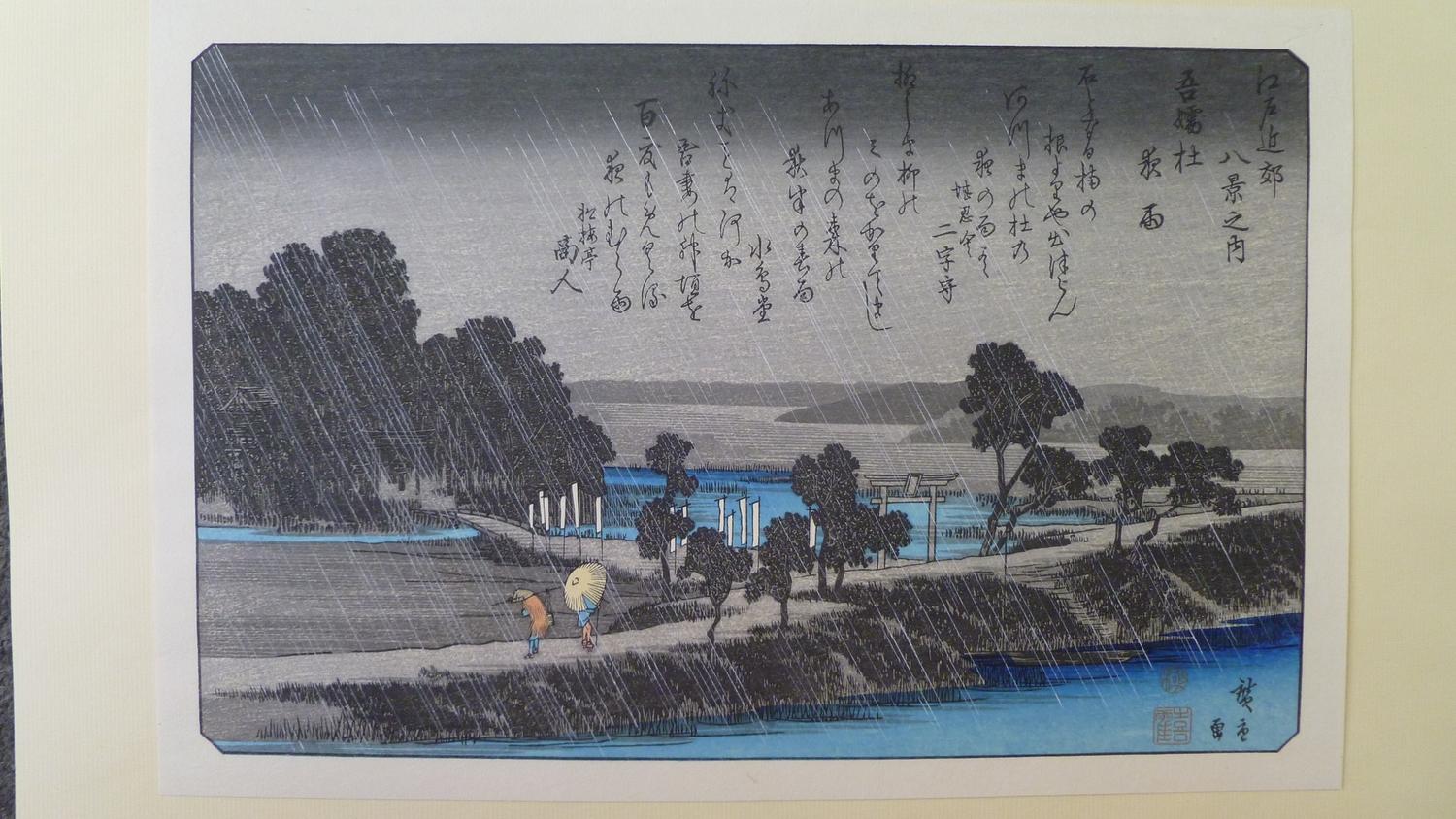 Hirishige, reworked plate. "EDO: Night Rain at Azuma Woods". 8-3/4"x13-3/4" image wih 1/2" paper border around. 20th C. impression, all around excellent with fresh colors