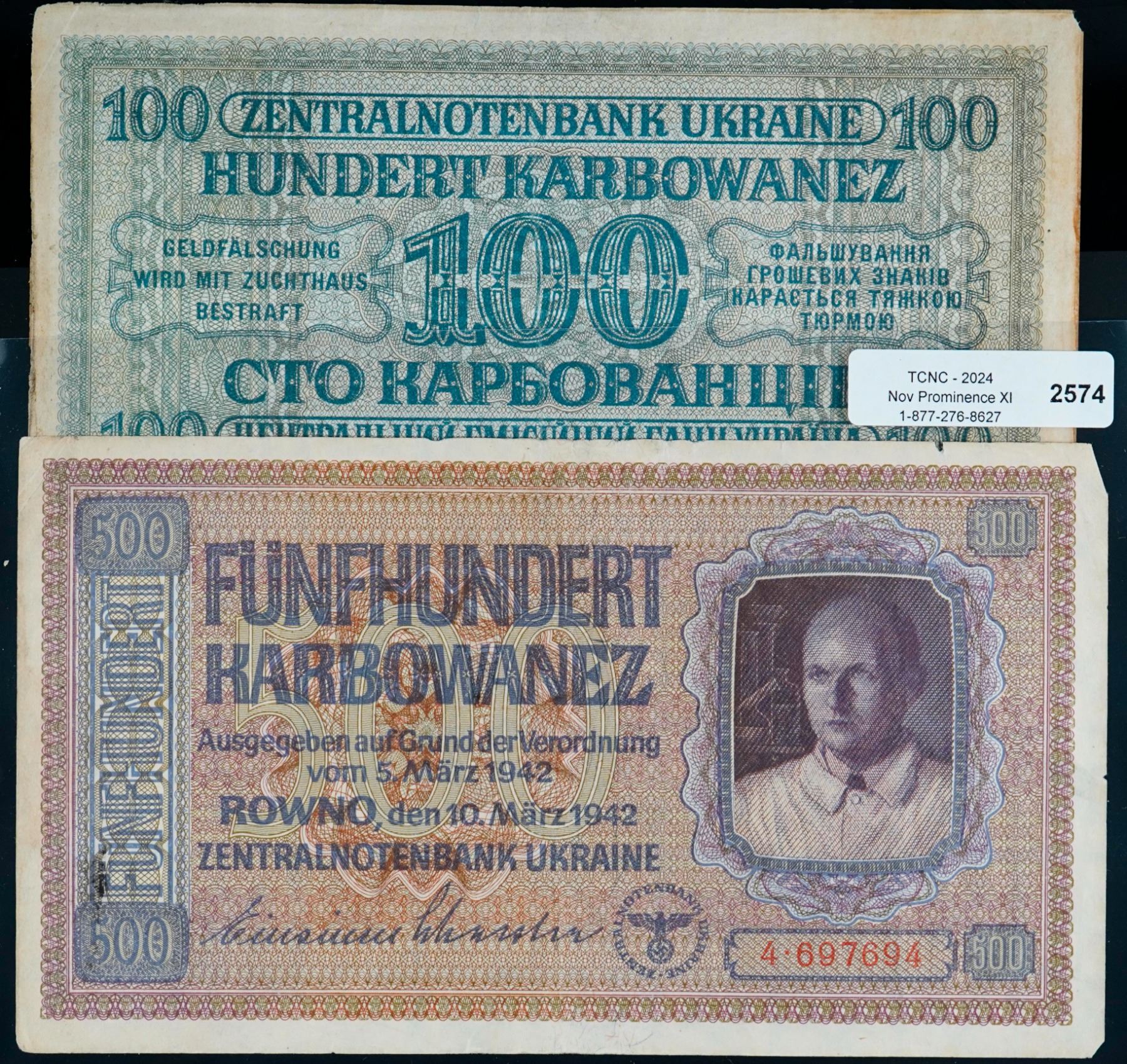 Ukraine; 1942 100 Harbowanez P#55 & 1942 500 Harbowanez P#57. Both notes VF or better. Lot of 2 notes.
