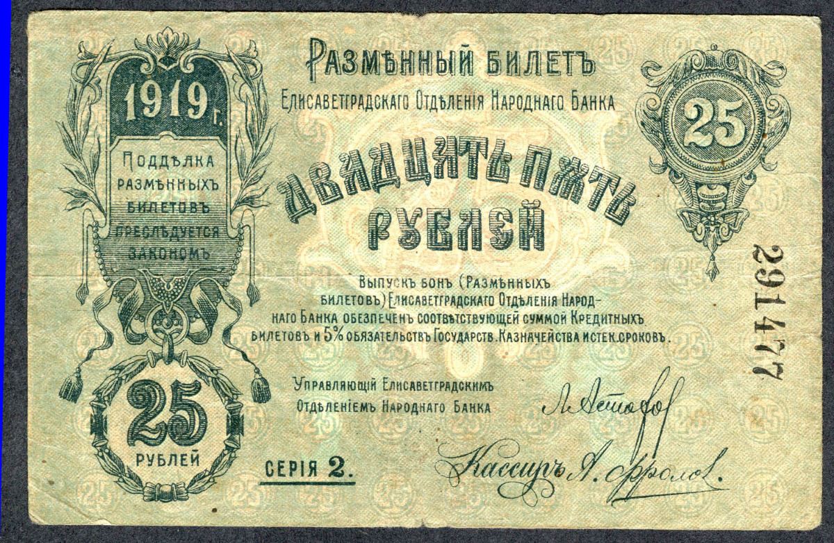 Ukraine Government Bank 1918 and National Bank Elizabet Grad 25 Rublei, Fine,Pic s324