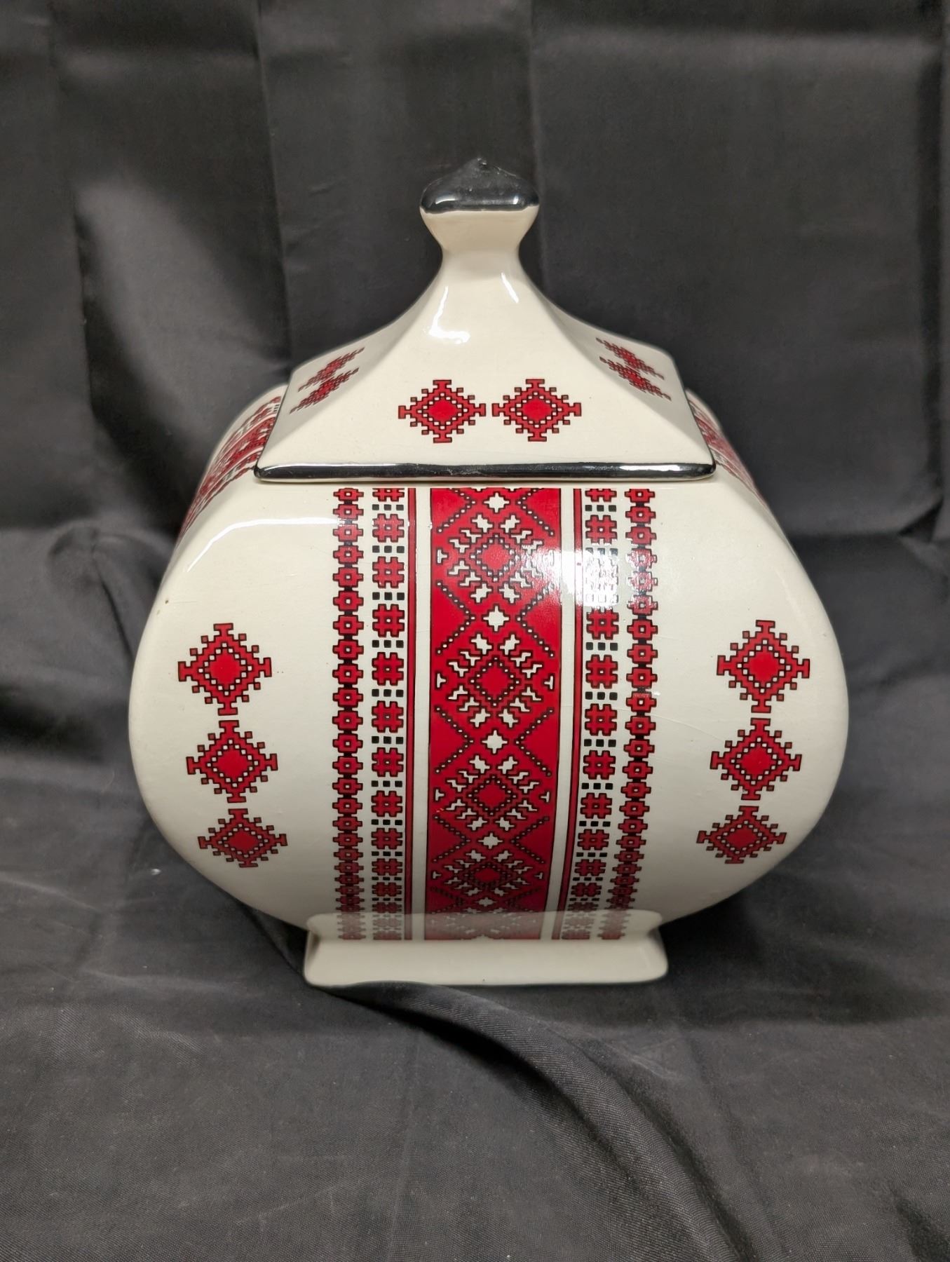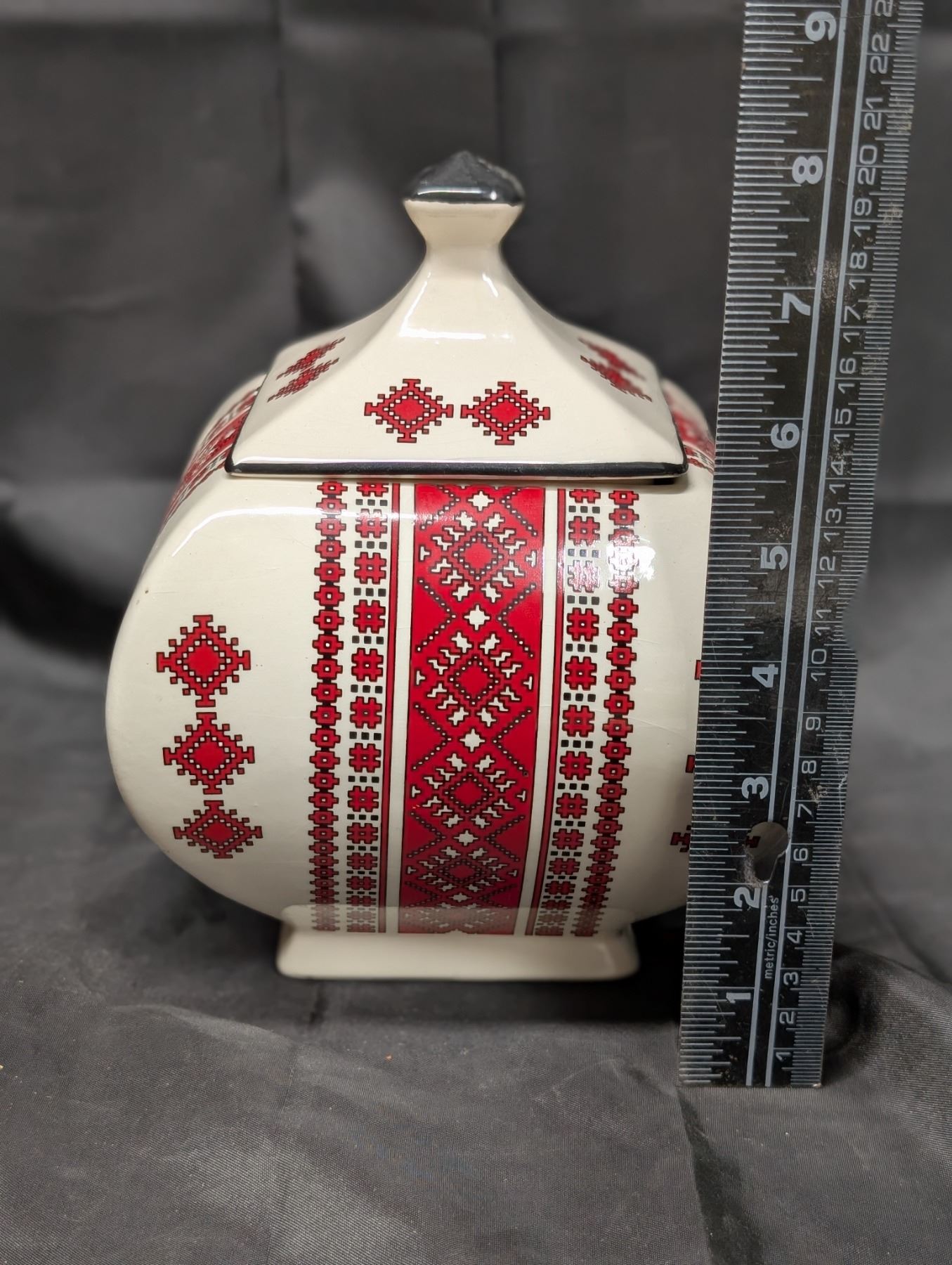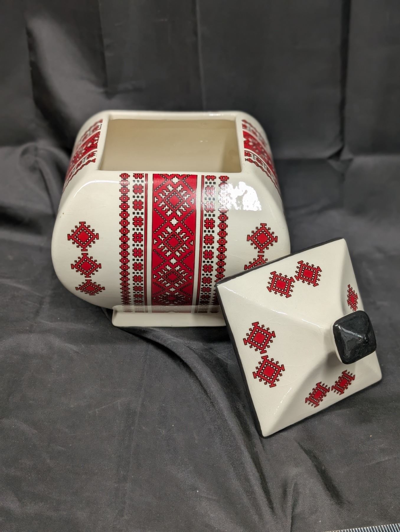 Ukrainian Arts Ceramic Red Cross Stitch Embroidery Lidded Jar
