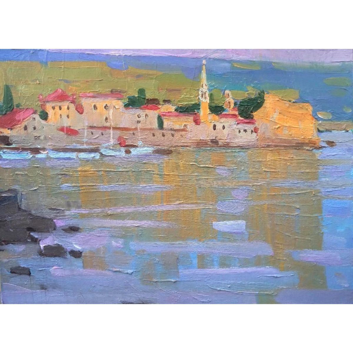 21st Century Impressionism, summer sunset, seascape, original oil on board painting by Ukrainian artist Anna Gusarova. Signed A. Gusarova, bottom right front & Anna Gusarova "Summer Sunset" 2016 on the reverse. 10" X 13 1/2". Â