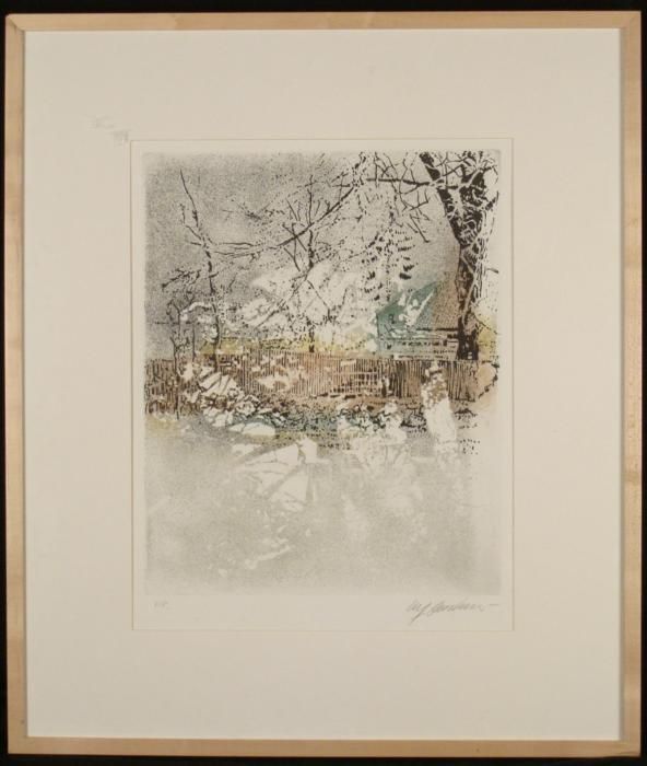 This art print portrays a fence in a snowy backyard. The specks and textures give this piece the feeling of a delicate fresh snowfall.Medium: Serigraph on paper Artist: Ulf OnsbergTitle: Snow FenceSignature: In pencil lower rightEdition: Artist Proof, marked AP, lower leftImage size: 15 1/2 x 19 1/2 inches Condition: Excellent; sticker residue on the Plexiglass can be cleaned off; a few light nicks around the frame, including upper left cornerFraming: In white matte, in natural light tone wood frame Frame size: 27 3/4 x 32 1/2 inchesCertificate of Authenticity: from Bittan Fine ArtBiography:Ulf Onsberg was born in 1932 in Kalmar, Sweden. He now lives in Malm , in the south of Sweden, but his art belongs to the world. Onsberg has gone through life armed with brush and paints, and has always gone his own way. Onsberg has been exhibited with large success during the last four decades, and found a vast audience of Onsberg collectors around the world. From the artist website: www.onsberg.se