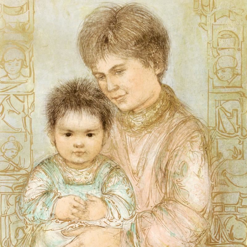 "Ulla and Eric" is a limited edition lithograph on rice paper, numbered and hand signed by Edna Hibel (1917-2014). Includes Certificate of Authenticity! Measures approx. 22.5" x 30" (with border), 18" x 24.5" (image).
