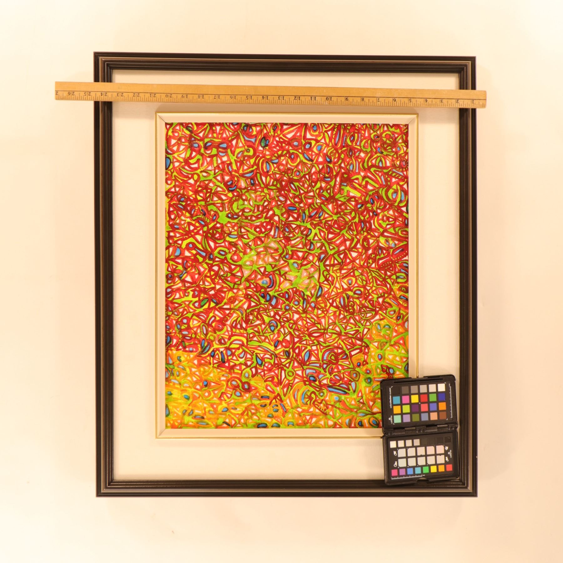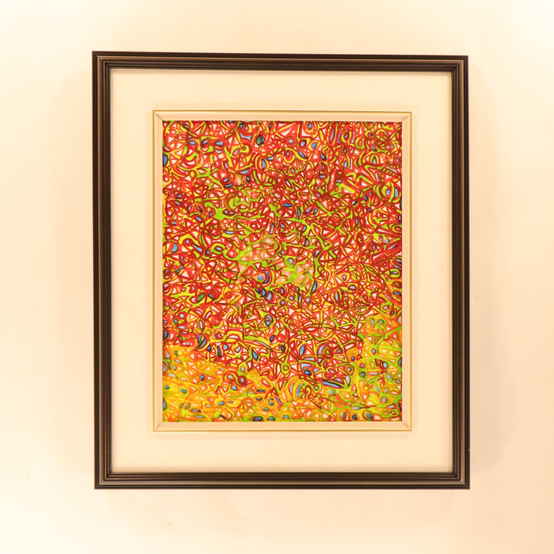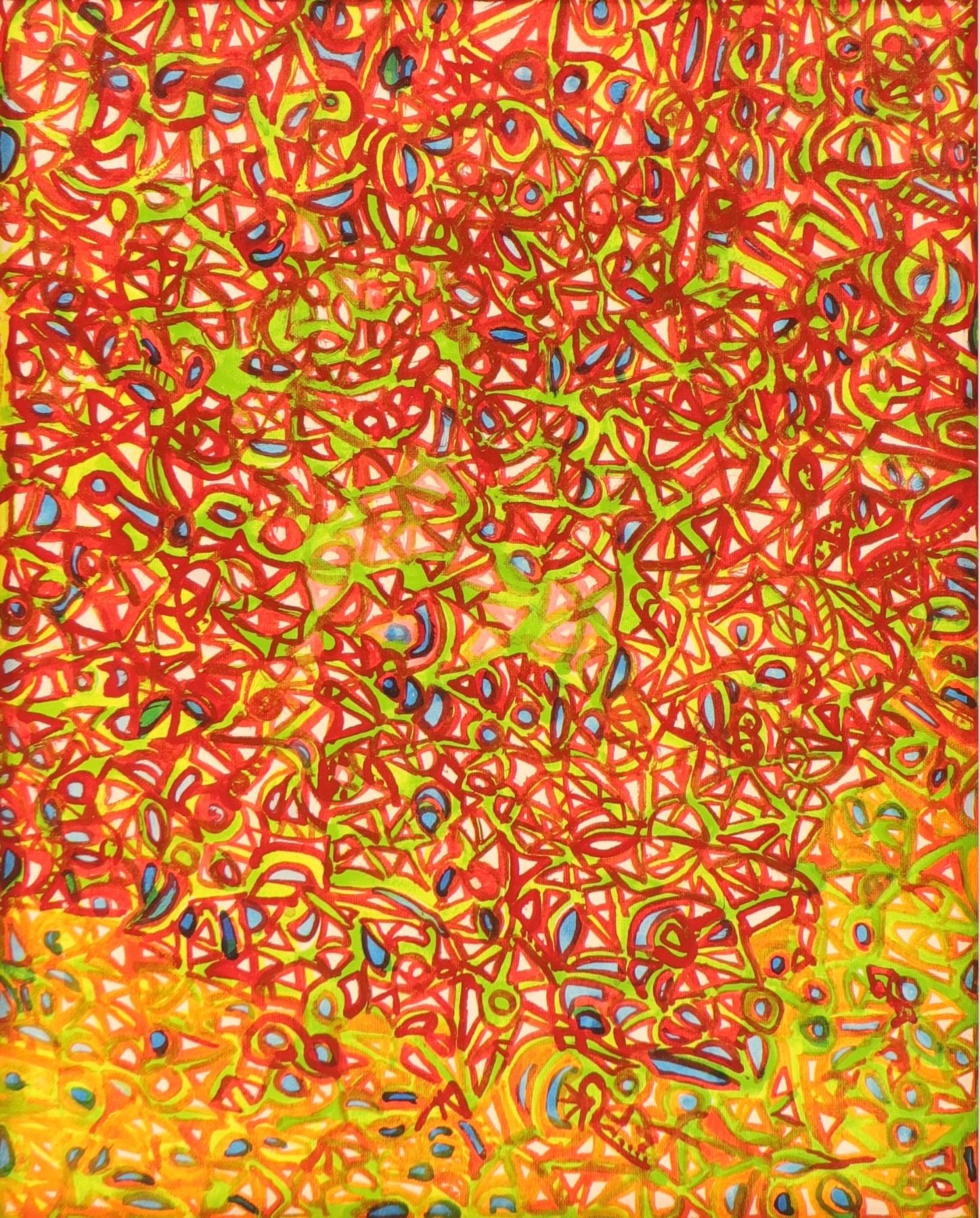Brightly coloured abstract painting on canvas by Ulrike (Uli) Rossier, centred on a dense field of looping, interlocking linear forms in saturated red, yellow, green, and touches of blue. The composition has a lively all-over structure, with rhythmic mark-making and layered pattern creating a sense of movement and visual vibration across the surface. The work fits Rossier’s characteristic approach to playful, shape-driven abstraction and her interest in colour relationships and repeating forms. Framed 25 x 29 in.; visible art 16 x 20 in.