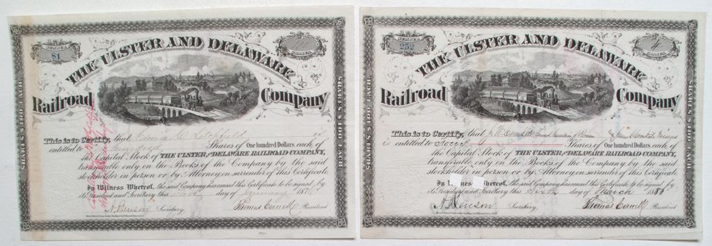 Two stock certificates. One #81, 1876 to Edwin Litchfield and one #252, 1886 to J. W. Cronkite. Both for 11 shares. Large vignette in top middle of steam train running through the countryside. Both signed by Thomas Carroll as president and A Benson as secretary. City: County: State: NY