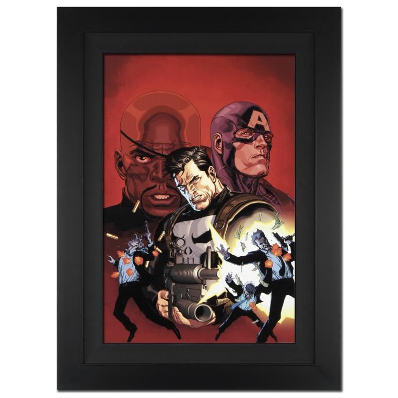 A piece of comic book history, this limited edition, from original art by Leinil Francis Yu, depicts the classic characters Punisher, Captain America, and Nick Fury. After winning the Wizard's Drawing Board Contest, Marvel Comics hired Leinil Francis Yu to work on the Wolverine series. After his run on Wolverine, he moved on to work on Marvel's core X-Men title in 2000. Yu continued to work on other Marvel titles such as Fantastic Four, Ultimate Wolverine vs. Hulk and New Avengers. "Ultimate Avengers #1" is an extremely limited edition numbered giclee on canvas by Leinil Francis Yu presented by Marvel Comics, hand signed by the great Stan Lee and numbered out of only 4! This piece was custom framed and ready to hang. Includes Certificate of Authenticity! Measure approx. 29" x 40" (with frame), 22" x 33" (image).
