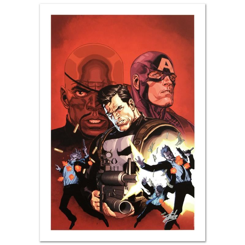 A piece of comic book history, this limited edition, from original art by Leinil Francis Yu, depicts the classic characters Punisher, Captain America, and Nick Fury. After winning the Wizard's Drawing Board Contest, Marvel Comics hired Leinil Francis Yu to work on the Wolverine series. After his run on Wolverine, he moved on to work on Marvel's core X-Men title in 2000. Yu continued to work on other Marvel titles such as Fantastic Four, Ultimate Wolverine vs. Hulk and New Avengers. "Ultimate Avengers #1" is a limited edition numbered giclee on canvas by Leinil Francis Yu presented by Marvel Comics, numbered and hand signed by the Great Stan Lee (1922-2018)! Includes Certificate of Authenticity! Measure approx. 18" x 27" (image).
