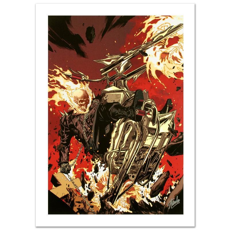 A piece of comic book history, this limited edition, from original art by Leinil Francis Yu, depicts Ghost Rider in a fury of flames. After winning the Wizard's Drawing Board Contest, Marvel Comics hired Leinil Francis Yu to work on the Wolverine series. After his run on Wolverine he moved on to work on Marvel's core X-Men title in 2000. Yu continued to work on other Marvel titles such as Fantastic Four, Ultimate Wolverine vs. Hulk and New Avengers. "Ultimate Avengers 2 #4" is a limited edition giclee on canvas by Leinil Francis Yu presented by Marvel Comics, numbered and hand signed by the great Stan Lee! Includes Certificate of Authenticity! Measures approx. 18" x 27" (image).