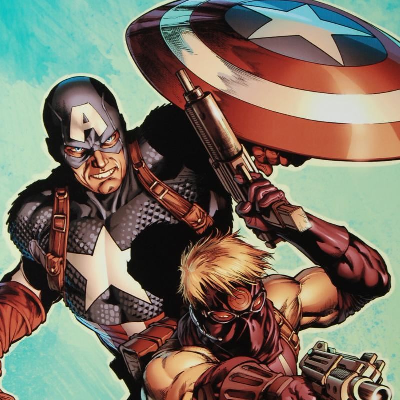 A piece of comic book history, this limited edition, from original art by Carlos Pacheco, depicts classic characters Captain America and Hawkeye. Pacheco first got attention in the United States for his work as penciller on Dark Guard, a Marvel UK title. This led to him being offered work by American comic editors leading to Marvel Comics' 1994 Bishop. Pacheco's art had become a fan favorite, with his work regularly getting coverage in magazines such as Wizard. In early 1997 Marvel acknowledged this by assigning Pacheco to one of its flagship titles, X-Men. In 2009, Pacheco signed an exclusive contract with Marvel. "Ultimate Avengers #2" is an extremely limited edition numbered giclee on canvas by Carlos Pacheco presented by Marvel Comics, hand signed by the great Stan Lee and numbered out of only 4! This piece comes custom framed and ready to hang. Includes Certificate of Authenticity! Measures approx. 29" x 40" (with frame); 22" x 33" (image).