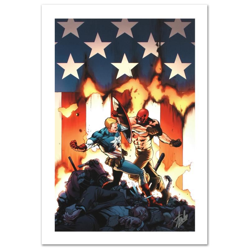 A piece of comic book history, this limited edition, from original art by Carlos Pacheco, depicts classic characters Captain America and Hawkeye. Pacheco first got attention in the United States for his work as penciller on Dark Guard, a Marvel UK title. This led to him being offered work by American comic editors leading to Marvel Comics' 1994 Bishop. Pacheco's art had become a fan favorite, with his work regularly getting coverage in magazines such as Wizard. In early 1997 Marvel acknowledged this by assigning Pacheco to one of its flagship titles, X-Men. In 2009, Pacheco signed an exclusive contract with Marvel. Ultimate Avengers #8" is a limited edition giclee on canvas by Carlos Pacheco presented Marvel Comics, numbered and hand signed by the Great Stan Lee (1922-2018)! Includes Certificate of Authenticity! Measures approx. 18" x 27" (image).