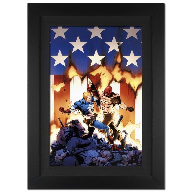 A piece of comic book history, this limited edition, from original art by Carlos Pacheco, depicts classic characters Captain America and Hawkeye. Pacheco first got attention in the United States for his work as penciller on Dark Guard, a Marvel UK title. This led to him being offered work by American comic editors leading to Marvel Comics' 1994 Bishop. Pacheco's art had become a fan favorite, with his work regularly getting coverage in magazines such as Wizard. In early 1997 Marvel acknowledged this by assigning Pacheco to one of its flagship titles, X-Men. In 2009, Pacheco signed an exclusive contract with Marvel. Ultimate Avengers #8" by Carlos Pacheco presented Marvel Comics, hand signed by the great Stan Lee and numbered out of only 10! This piece comes custom framed and ready to hang. Includes Certificate of Authenticity! Measures approx. 25" x 34" (with frame); 18" x 27" (image).