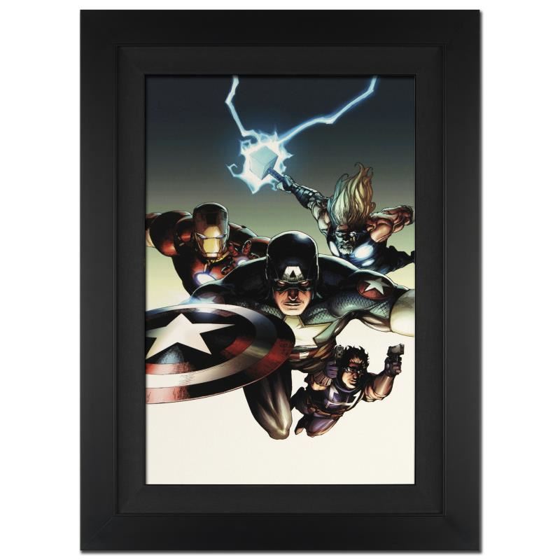 A piece of comic book history, this limited edition, from original art by Leinil Francis Yu, depicts the heroic Avengers. After winning the Wizard's Drawing Board Contest, Marvel Comics hired Leinil Francis Yu to work on the Wolverine series. After his run on Wolverine, he moved on to work on Marvel's core X-Men title in 2000. Yu continued to work on other Marvel titles such as Fantastic Four, Ultimate Wolverine vs. Hulk and New Avengers. "Ultimate Avengers vs. New Ultimates #2" is a limited edition giclee on canvas by Leinil Francis Yu presented by Marvel Comics, hand signed by the great Stan Lee and numbered out of only 10! This piece has been custom framed and is ready to hang! Includes Certificate of Authenticity! Measures approx. 25" x 34" (with frame) 18" x 27" (image).