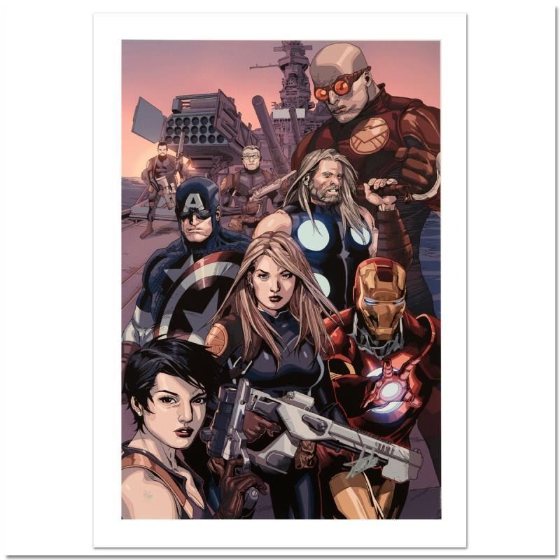 "Ultimate Avengers vs. New Ultimates #2" is a limited edition giclee on canvas with art by Leinil Francis Yu. Officially licensed by Marvel, this piece is numbered 3/99 and hand signed by creative legend Stan Lee (1922-2018). The piece comes with a certificate of authenticity. Measures approximately 27" x 18".