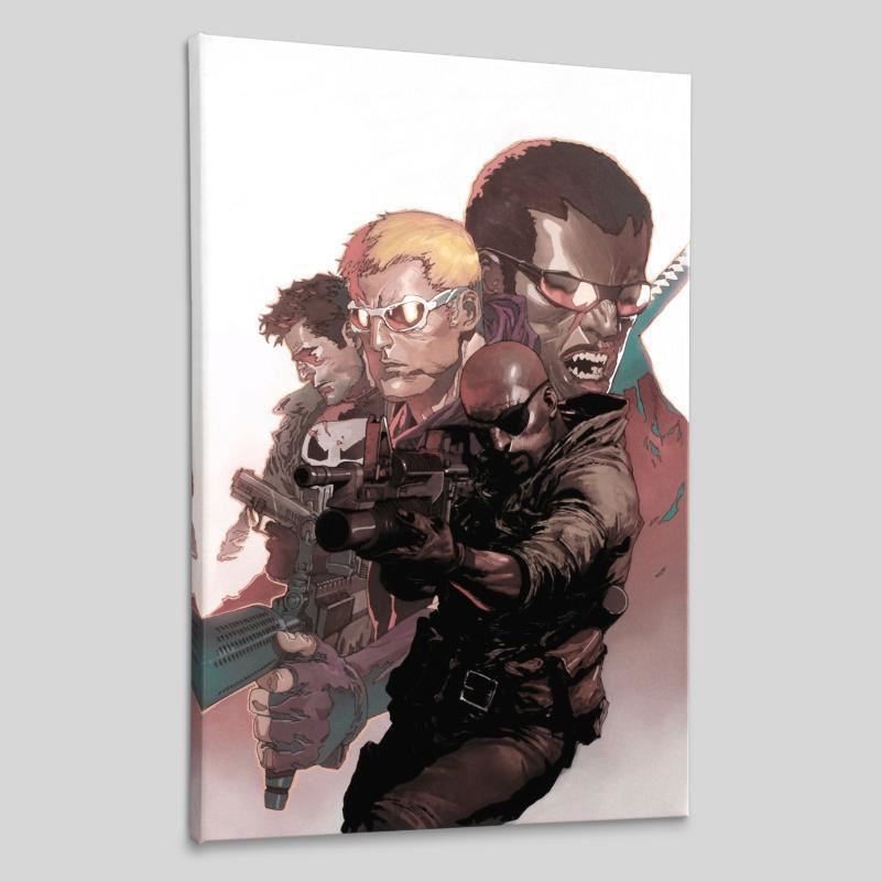 A piece of comic book history, this limited edition, from original art by Leinil Francis Yu, depicts Nick Fury. After winning the Wizard's Drawing Board Contest, Marvel Comics hired Leinil Francis Yu to work on the Wolverine series. After his run on Wolverine, he moved on to work on Marvel's core X-Men title in 2000. Yu continued to work on other Marvel titles such as Fantastic Four, Ultimate Wolverine vs. Hulk and New Avengers. "Ultimate Avengers Vs. New Ultimates #4" is a limited edition giclee on canvas by Leinil Francis Yu presented by Marvel Comics! This piece comes gallery wrapped. Includes Certificate of Authenticity! Measures approx. 18" x 27" (image); 1.5" (depth).