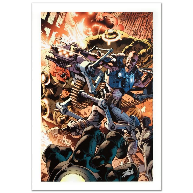 A piece of comic book history, this limited edition, from original art by Bryan Hitch, depicts an adventure packed scene starring Nick Fury. British artist Bryan Hitch was inspired by comic books at an early age. Not only has Hitch worked on the The Avengers, Captain America, and She-Hulk, but he also did the character design for the Ultimate Avengers and Ultimate Avengers 2 animated films. "Ultimate Doom #1" is a limited edition giclee on canvas by Bryan Hitch presented by Marvel Comics, numbered and hand signed by the Great Stan Lee (1922-2018)! Includes Certificate of Authenticity! Measures approx. 18" x 27" (image).