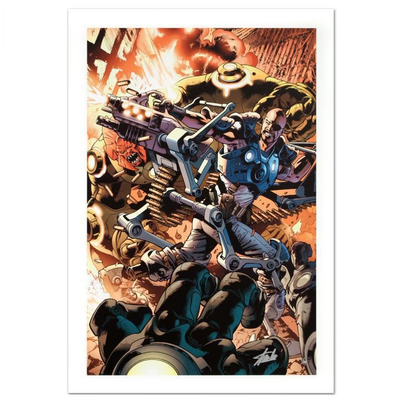 "Ultimate Doom #1" is a limited edition giclee on canvas with art by Bryan Hitch". Officially licensed by Marvel, this piece is numbered 1/99 and hand signed by creative legend Stan Lee (1922-2018). The piece comes with a certificate of authenticity. Measures approximately 27" x 18".