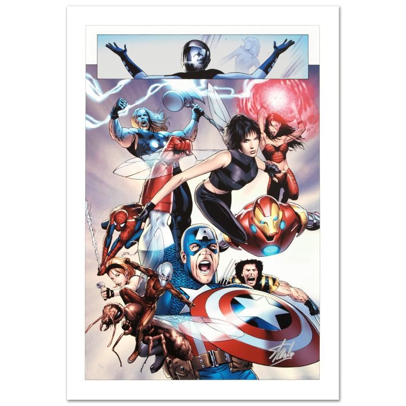 A piece of comic book history, this limited edition, from original art by Greg Land, depicts an epic battle between Namor and the Human Torch. Greg Land entered the comic industry in the 90s as a comic book penciler and he's best known for X-Men: Phoenix-Endsong, Ultimate Fantastic Four as well as a variety of cover art. "Ultimate Fantastic Four #26" is a limited edition giclee on canvas by Greg Land presented by Marvel Comics, numbered and hand signed by the great Stan Lee! Includes Certificate of Authenticity! Measures approx. 18" x 27" (image).