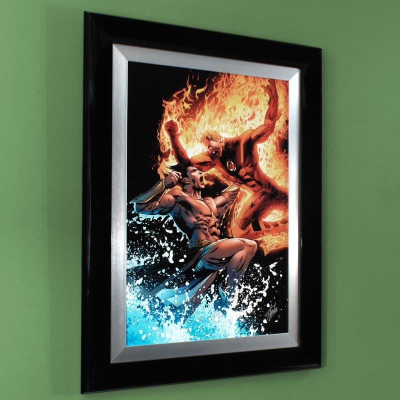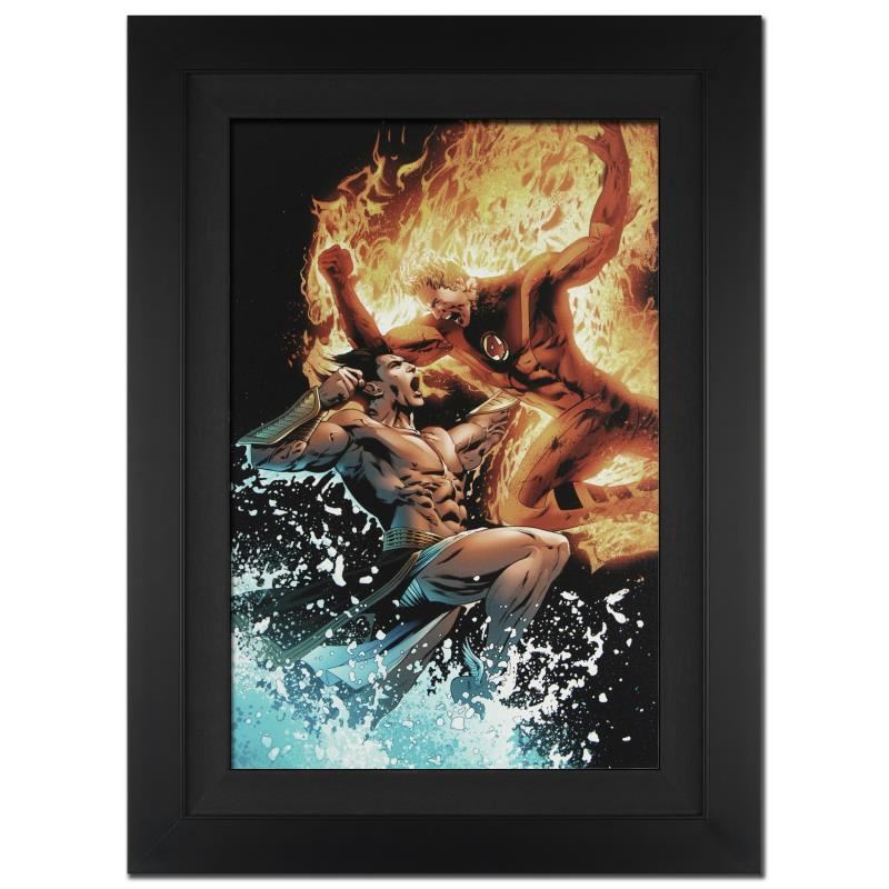 A piece of comic book history, this limited edition, from original art by Greg Land, depicts an epic battle between Namor and the Human Torch. Greg Land entered the comic industry in the 90s as a comic book penciler. Currently, he's best known for X-Men: Phoenix-Endsong, Ultimate Fantastic Four as well as a variety of cover art. "Ultimate Fantastic Four #26" is an extremely limited edition giclee on canvas by Greg Land presented by Marvel Comics, hand signed by the Great Stan Lee (1922-2018) and numbered out of only 4! This piece comes custom framed and ready to hang. Includes Certificate of Authenticity! Measure approx. 29" x 40" (with frame), 22" x 33" (image).