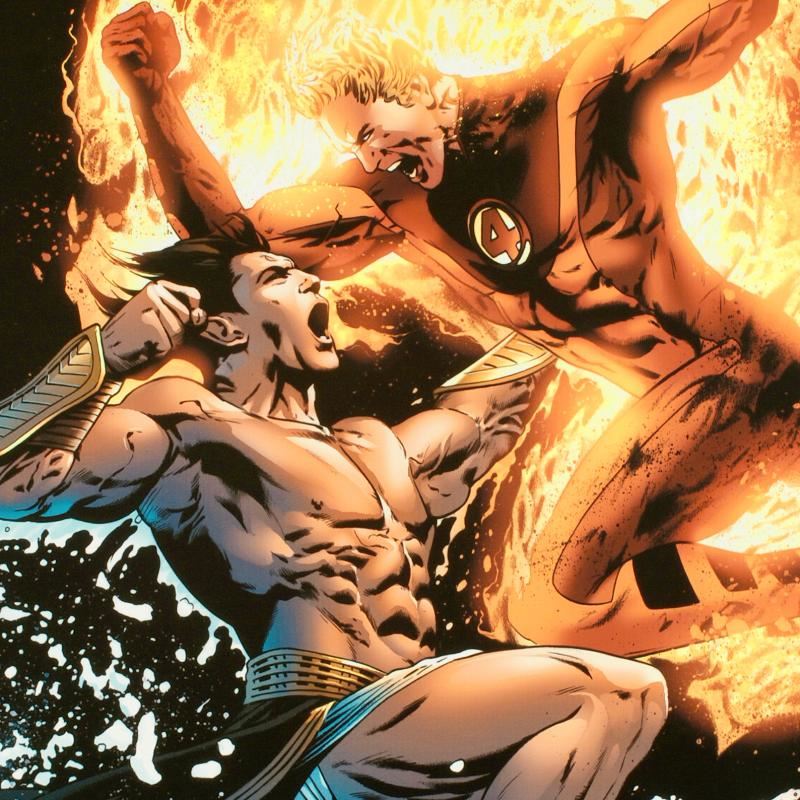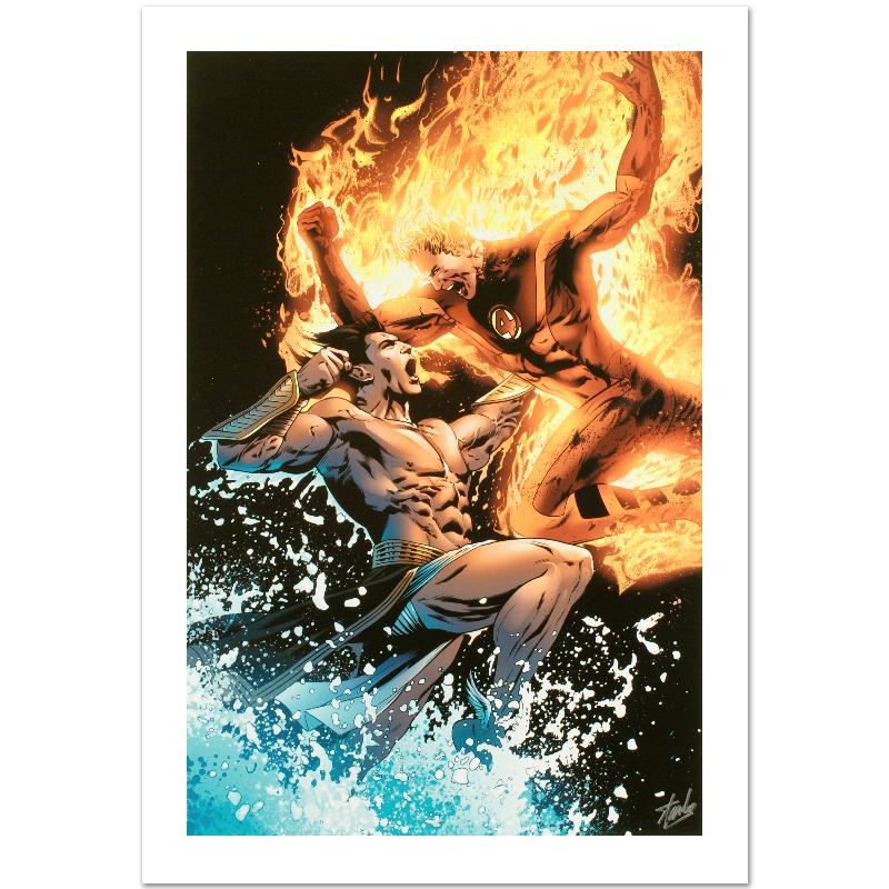 A piece of comic book history, this limited edition, from original art by Greg Land, depicts an epic battle between Namor and the Human Torch. Greg Land entered the comic industry in the 90s as a comic book penciler. Currently, he's best known for X-Men: Phoenix-Endsong, Ultimate Fantastic Four as well as a variety of cover art. "Ultimate Fantastic Four #26" is a limited edition giclee on canvas by Greg Land presented by Marvel Comics, numbered and hand signed by the Great Stan Lee (1922-2018)! Includes Certificate of Authenticity! Measures approx. 18" x 27" (image).