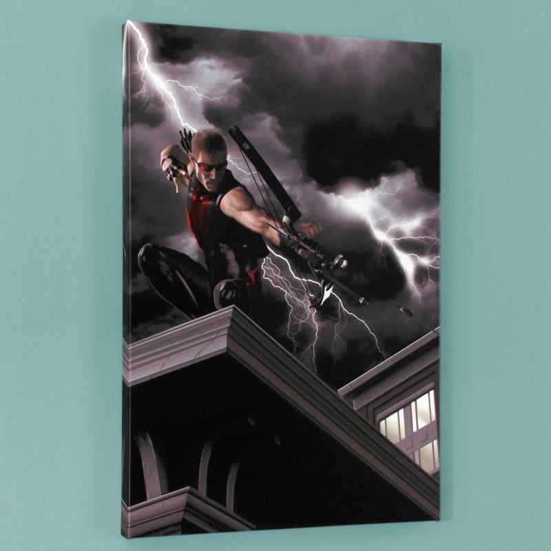 A piece of comic book history, this limited edition, from original art by Kaare Andrews, depicts the heroic Hawkeye. Kaare Andrews is a Canadian comic book writer and artist and filmmaker known for his cover work on Incredible Hulk and many other comic books published by Marvel Comics. He was the first recipient of The Shuster Award for Outstanding Artist in 2005 for his work on Spider-Man: Doctor Octopus. He has also worked on Ultimate X-Men, Gen, The Amazing Spider-Man and The Matrix Comics. "Ultimate Hawkeye #2" is a limited edition numbered giclee on canvas by Kaare Andrews presented by Marvel Comics. This piece comes gallery wrapped. Includes Certificate of Authenticity! Measures approx. 18" x 27" (image).