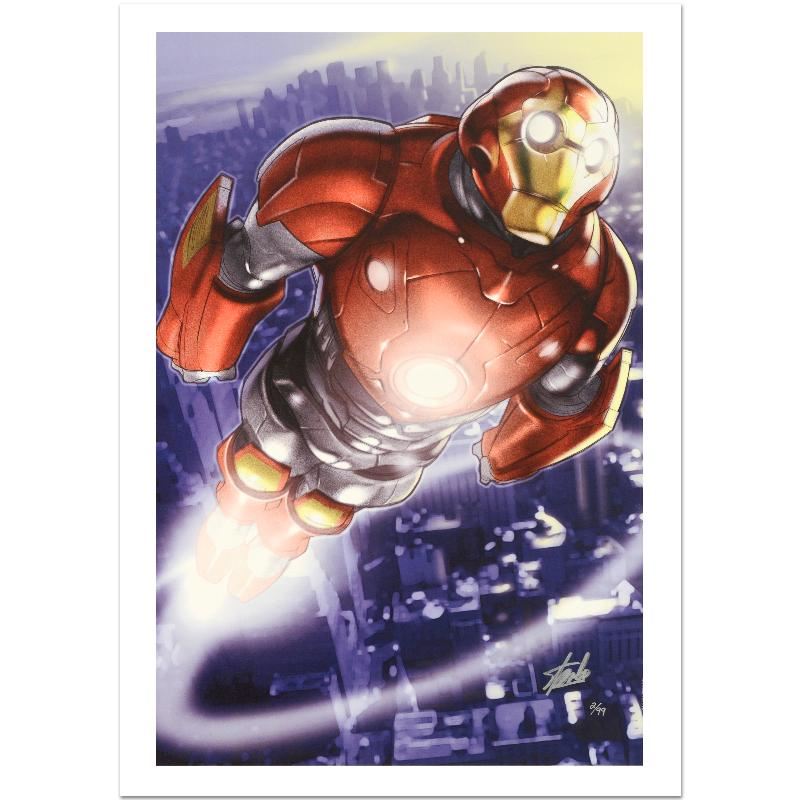 A piece of comic book history, this limited edition, from original art by Pasqual Ferry, depicts the classic character Iron Man. Known for his work on Heroes for Hire, Action Comics, and Adam Strange, Pasqual Ferry is now the new artist for Marvel's Ultimate Fantastic Four. "Ultimate Iron Man II #3" is a limited edition giclee on canvas by Pasqual Ferry presented by Marvel Comics, numbered and hand signed by the Great Stan Lee (1922-2018)! Includes Certificate of Authenticity! Measures approx. 18" x 27" (image).