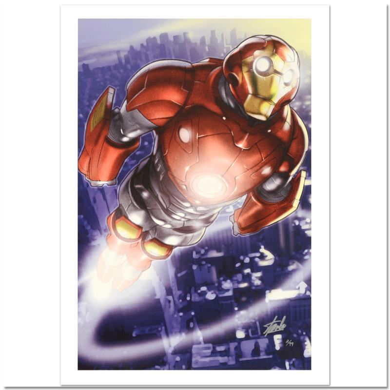 "Ultimate Iron Man II #3" is a limited edition giclee on canvas with art by Pasqual Ferry. Officially licensed by Marvel, this piece is numbered 1/99 and hand signed by creative legend Stan Lee (1922-2018). The piece comes with a certificate of authenticity. Please note the piece has some minor speck imperfections under close inspection, but generally displays fine. Measures approximately 27" x 18".
