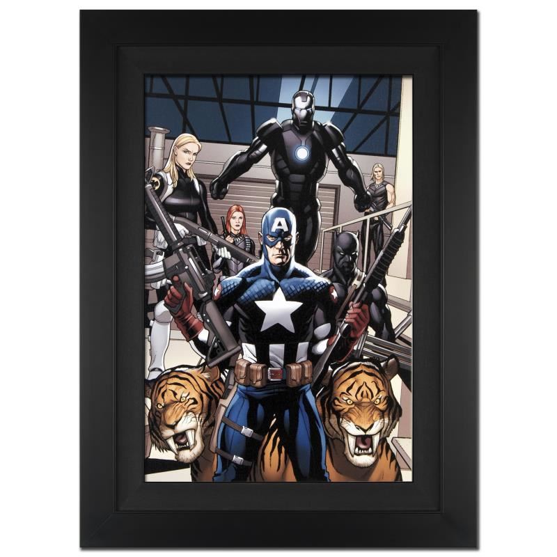 A piece of comic book history, this limited edition, from original art by Frank Cho, depicts Captain America, Black Panther, Carol Danvers, Iron Man, Shanna The She-Devil, Ka-Zar. A self-taught artist, Frank Cho has drawn issues of The New Avengers, the Hulk, and Spider-Man, among others. "Ultimate New Ultimates #3" is an extremely limited edition giclee on canvas by Frank Cho presented by Marvel Comics, hand signed by the Great Stan Lee (1922-2018) and numbered out of only 10! This piece comes custom framed and ready to hang. Includes Certificate of Authenticity! Measures approx. 25" x 34" (with frame); 18" x 27" (image).