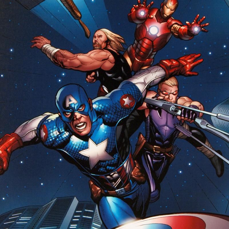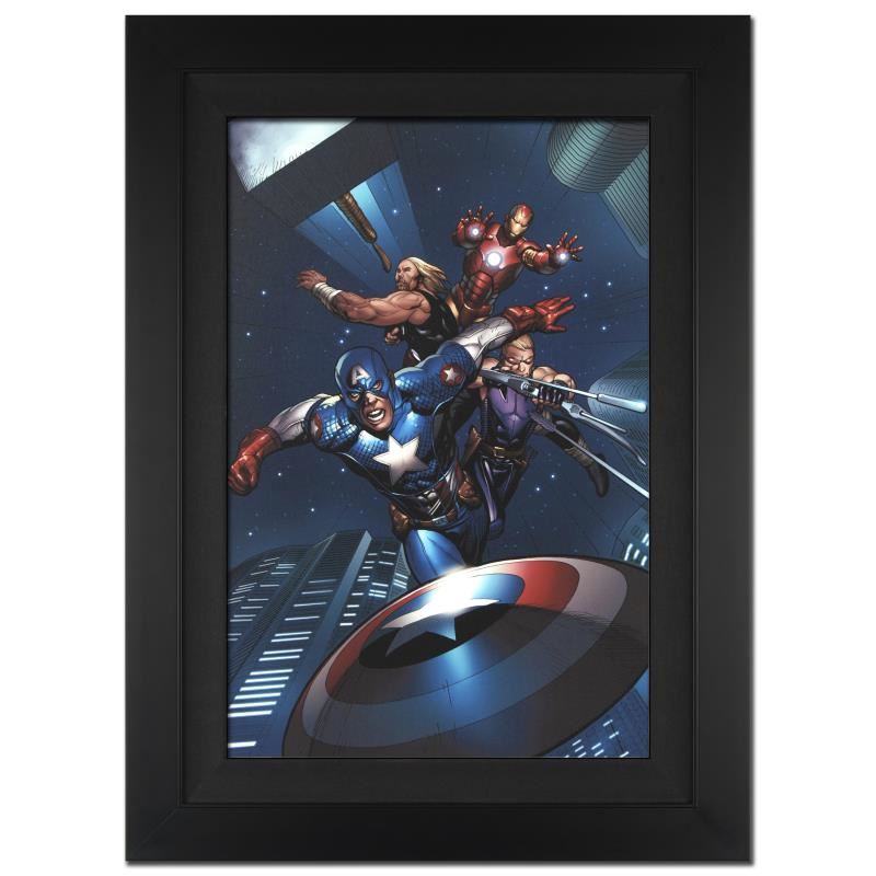 A piece of comic book history, this limited edition, from original art by Frank Cho, depicts Captain America, Thor, Hawkeye and Iron Man. A self-taught artist, Frank Cho has drawn issues of The New Avengers, the Hulk, and Spider-Man, among others. "Ultimate New Ultimates #5" is a limited edition giclee on canvas by Frank Cho presented by Marvel Comics, hand signed by the great Stan Lee and numbered out of only 10! This piece is custom framed and is ready to hang! Includes Certificate of Authenticity! Measures approx. 25" x 34" (with frame); 18" x 27" (image).