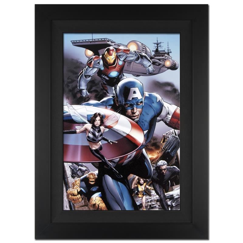 A piece of comic book history, this limited edition, from original art by Greg Land, depicts the classic characters Captain America, Thing, and Iron Man. Greg Land got his start as an illustrator for an independent publisher. After landing a job at Marvel, Land has produced illustrations for X-Men and the Fantastic Four, among others. "Ultimate Power #6" is an extremely limited edition giclee on canvas by Greg Land presented by Marvel Comics, hand signed by the great Stan Lee and numbered out of only 10! This piece comes custom framed and ready to hang. Includes Certificate of Authenticity! Measures approx. 25" x 34" (with frame), 18" x 27" (image).