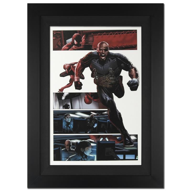 A piece of comic book history, this limited edition, from original art by Greg Land, depicts the classic characters Nick Fury and Spider-Man. Greg Land got his start as an illustrator for an independent publisher. After landing a job at Marvel, Land has produced illustrations for X-Men and the Fantastic Four, among others. "Ultimate Power #6" is an extremely limited edition giclee on canvas by Greg Land presented by Marvel Comics, hand signed by the Great Stan Lee (1922-2018) and numbered out of only 10! This piece comes custom framed and ready to hang. Includes Certificate of Authenticity! Measures approx. 25" x 34" (with frame), 18" x 27" (image).