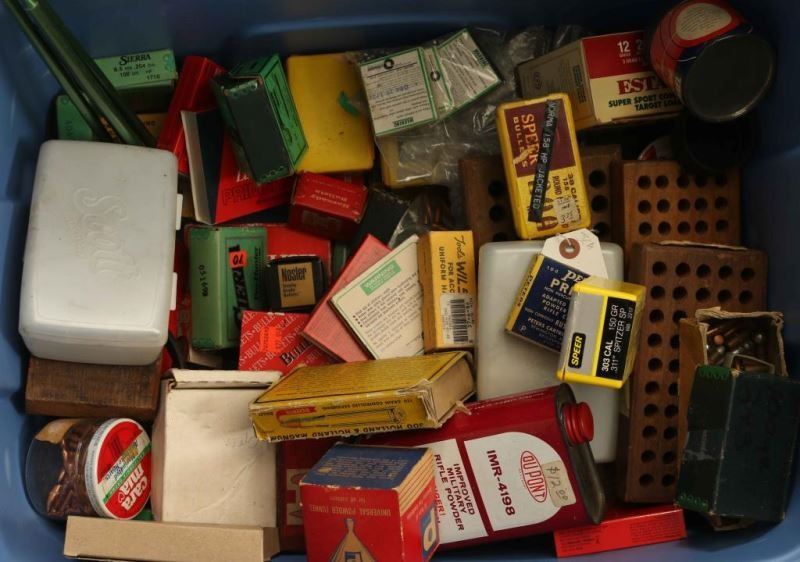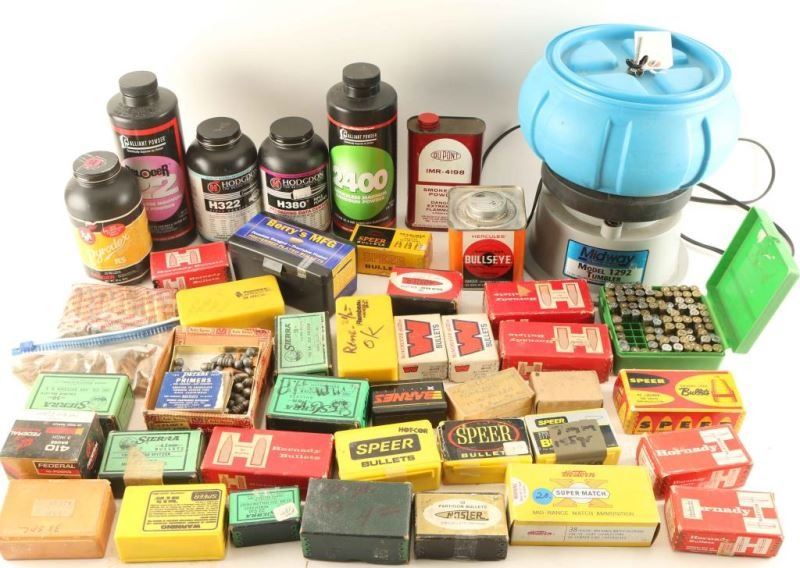 Including powder h322, IMR -4198,22Mag,240Handgun, H380. Also included bullets 45,30-30,270,308Spitzer,38SPL,303Cal, 7mm,6.5,38, 270 and more!!! Large Rifle primers, tools , funnels and random brass. Also included is a Tumbler Midway 1292 and Springfield muzzle brake, to many items to list.