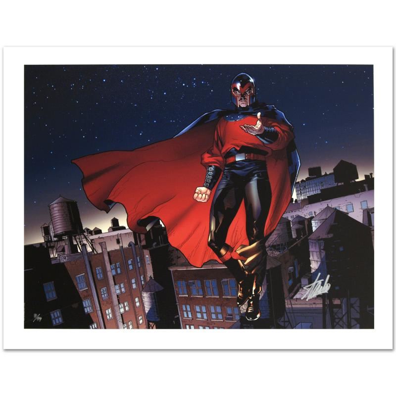 A piece of comic book history, this limited edition, from original art by Stuart Immonen, depicts the classic villain Magneto. Stuart Immonen is a Canadian comic book artist. He is best known for his work on Nextwave, Ultimate X-Men, The New Avengers and Ultimate Spider-Man. Immonen studied at Toronto's York University, pursuing a career in art. In 1988, he self-published a series called "Playground" - it was his first published work. He worked at several smaller comic book companies before being hired by DC Comics and Marvel Comics in 1993. "Ultimate Spider-Man #119" is a limited edition giclee on canvas by Stuart Immonen presented by Marvel Comics, numbered and hand signed by the great Stan Lee! Includes Certificate of Authenticity! Measures approx. 24" x 18" (image).