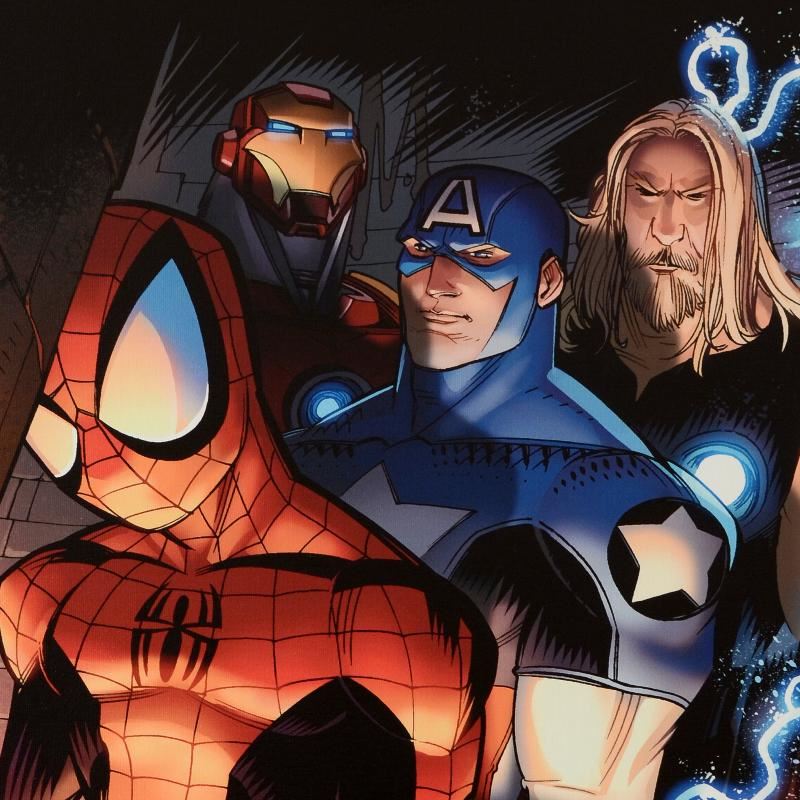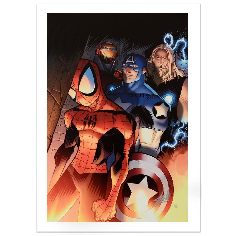 A piece of comic book history, this limited edition, from original art by David Lafuente, depicts the classic characters Spider-Man, Captain America, Iron Man, and Thor. David Lafuente has drawn cover art for such franchises as X-Men and Spider-Man. "Ultimate Spider-Man #151" a limited edition giclee on canvas by David Lafuente presented by Marvel Comics, numbered and hand signed by the great Stan Lee! Includes Certificate of Authenticity! Measure approx. 18" x 27" (image).