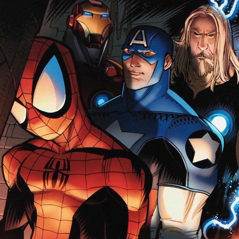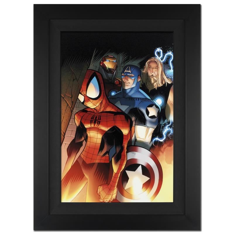 A piece of comic book history, this limited edition, from original art by David Lafuente, depicts the classic characters Spider-Man, Captain America, Iron Man, and Thor. David Lafuente has drawn cover art for such franchises as X-Men and Spider-Man. "Ultimate Spider-Man #151" is an extremely limited edition giclee on canvas by David Lafuente presented by Marvel Comics, hand signed by the great Stan Lee and numbered out of only 10! This piece comes custom framed and ready to hang. Includes Certificate of Authenticity! Measures approx. 25" x 34" (with frame), 18" x 27" (image).