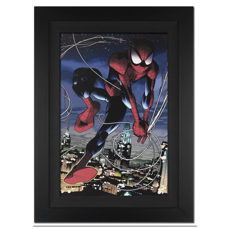 A piece of comic book history, this limited edition, from original art by Sara Pichelli, depicts Spider-Man. Sara Pichelli is an Italian artist; she got her start in animation before entering into the world of comic book artistry. She joined the Marvel Comics team in 2008, after being discovered in an international talent search. Pichelli is the artist responsible for the Miles Morales Version of Ultimate Spider-Man. In 2011 Pichelli won an Eagle Award for Favorite Newcomer Artist. "Ultimate Spider-Man #152" is an extremely limited edition giclee on canvas by Sara Pichelli presented by Marvel Comics, hand signed by the great Stan Lee and numbered out of only 10! This piece is custom framed and ready to hang. Includes Certificate of Authenticity! Measure approx. 25" x 34" (with frame), 18" x 27" (image).