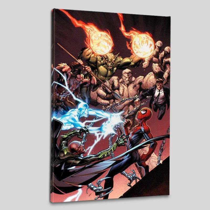 A piece of comic book history, this limited edition, from original art by Mark Bagley, depicts Spider-Man, Electro, Vulture, Kraven the Hunter, Green Goblin, Sandman, and Dr. Octopus. Mark Bagley got his start by winning Marvel's Try-Out contest, for which he was awarded penciling jobs. Soon, Bagley was drawing regularly for the renowned Spider-Man franchise. "Ultimate Spider-Man #158" is a limited edition giclee on canvas by Mark Bagley presented by Marvel Comics, presented by Marvel Comics. This piece comes gallery wrapped. Includes Certificate of Authenticity! Measure approx. 18" x 27" (image).