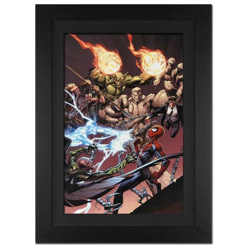 A piece of comic book history, this limited edition, from original art by Mark Bagley, depicts Spider-Man, Iceman, Vulture, Kraven the Hunter, Green Goblin, Sandman, and Dr. Octopus. Mark Bagley got his start by winning Marvel's Try-Out contest, for which he was awarded penciling jobs. Soon, Bagley was drawing regularly for the renowned Spider-Man franchise. "Ultimate Spider-Man #158" is a limited edition giclee on canvas by Mark Bagley presented by Marvel Comics, hand signed by the Great Stan Lee (1922-2018) and numbered out of only 10! This piece comes custom framed using aicd free and archival materials and is ready to hang. Includes Certificate of Authenticity! Measures approx. 25" x 34" (with frame), 18" x 27" (image).